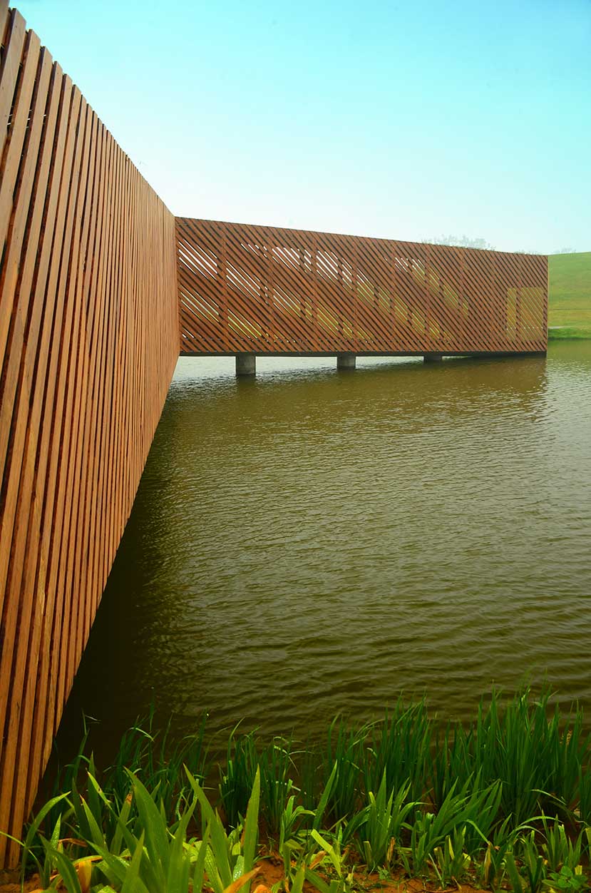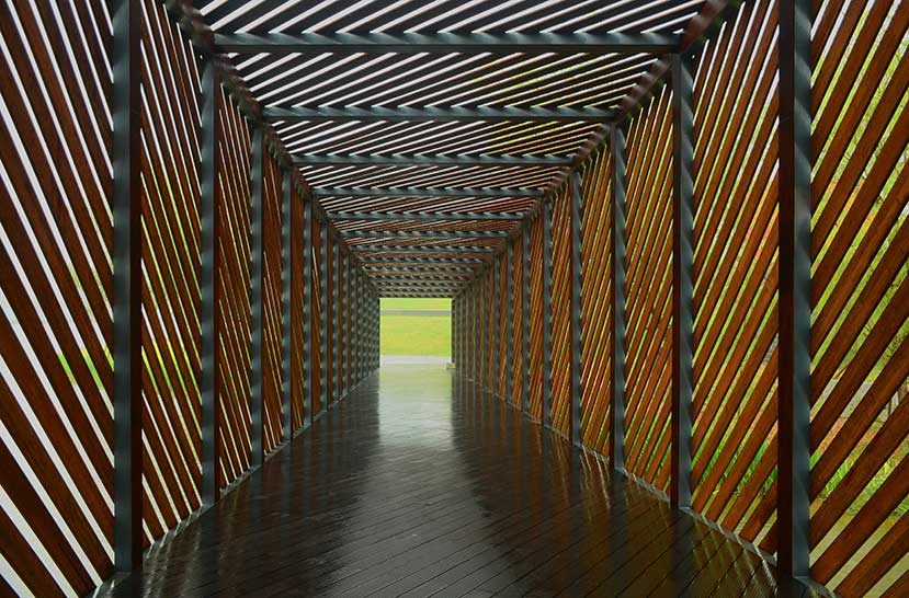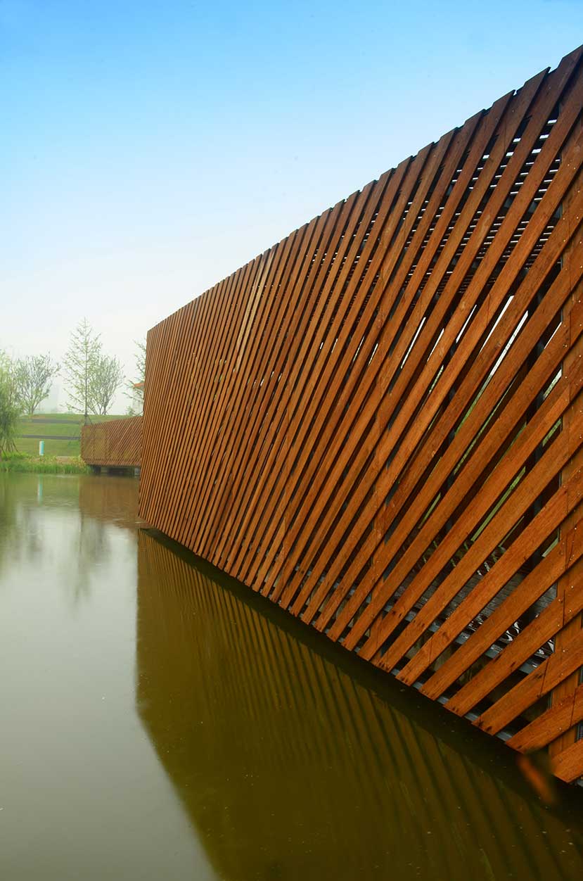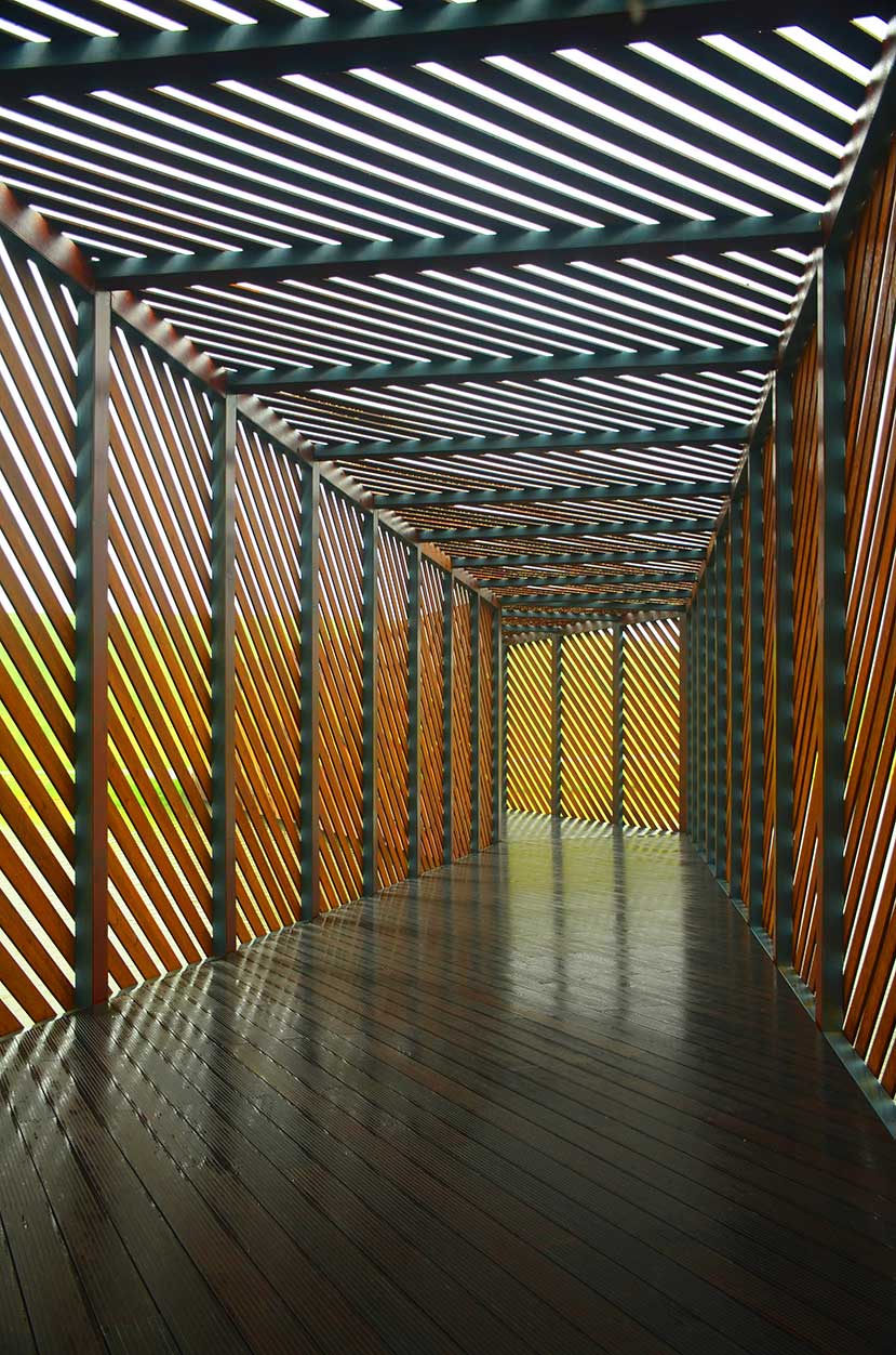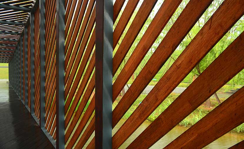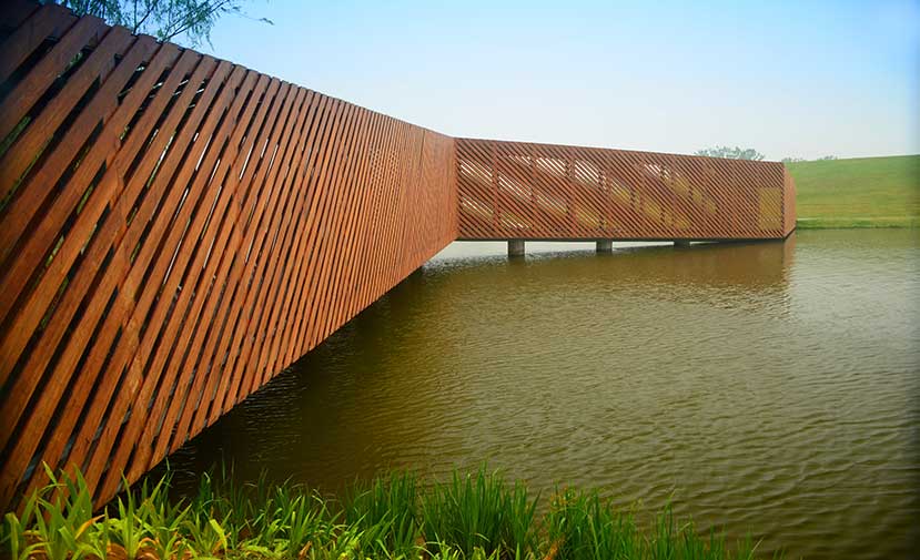 該景觀橋位于鄭州正弘中央公園內(nèi),主體為鋼架結(jié)構(gòu),運用桃花江戶外高炭防腐竹地板與淺炭格柵進行造型與裝飾。景觀橋設(shè)計干練、簡約,直線條與斜線條有力的勾勒與極具親和力的戶外竹材表達使得景觀橋極具北歐風情,成為公園內(nèi)的景觀核心。