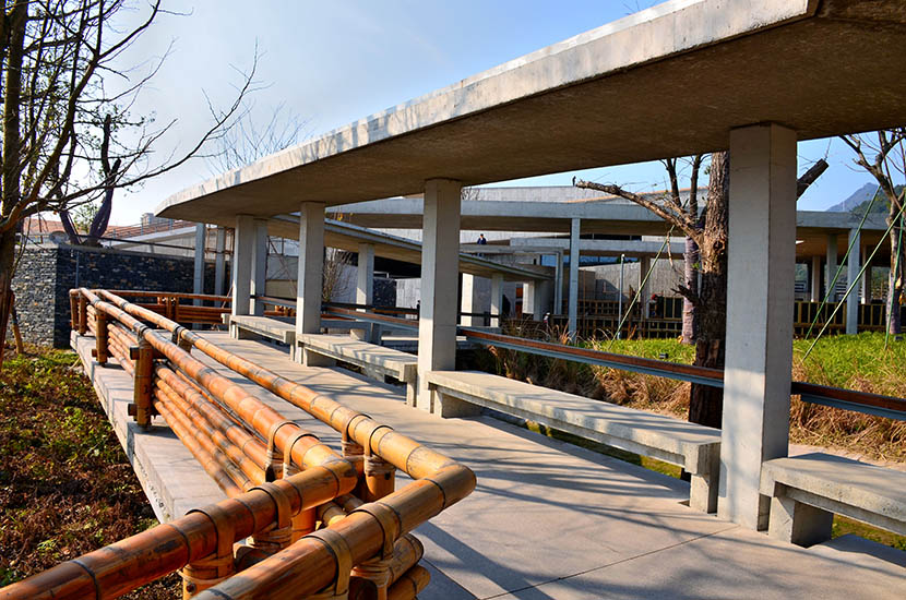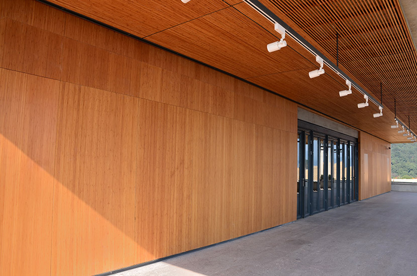 富陽(yáng)公望美術(shù)館也叫富春山館, 位于杭州市富陽(yáng)區(qū), 是集博物館、美術(shù)館、檔案館 三館合一的建筑綜合體, 由著名設(shè)計(jì)大師 王澍設(shè)計(jì)。 大師以蘇東坡《題西林壁》里的描繪 為靈感來(lái)源, 按照中國(guó)傳統(tǒng)的山水序列, 建筑整體構(gòu)筑中呈現(xiàn)近山、 遠(yuǎn)山瀠洄呼應(yīng)的構(gòu)筑法則和三遠(yuǎn)視角, 與咫尺之遙的富春山水互相輝映。 美術(shù)館設(shè)計(jì)成內(nèi)山和外山, 站在屋頂會(huì)看到一整片美術(shù)館都是外山, 而頂上兩件小居, 正是設(shè)計(jì)師心中的富春山居。 美術(shù)館大量運(yùn)用桃花江戶外防腐竹材 和室內(nèi)裝飾竹材, 是典型的竹元素主題建筑, 在文化場(chǎng)所的建設(shè)中 竹材 是設(shè)計(jì)師表達(dá)設(shè)計(jì)文化內(nèi)涵的有力工具。