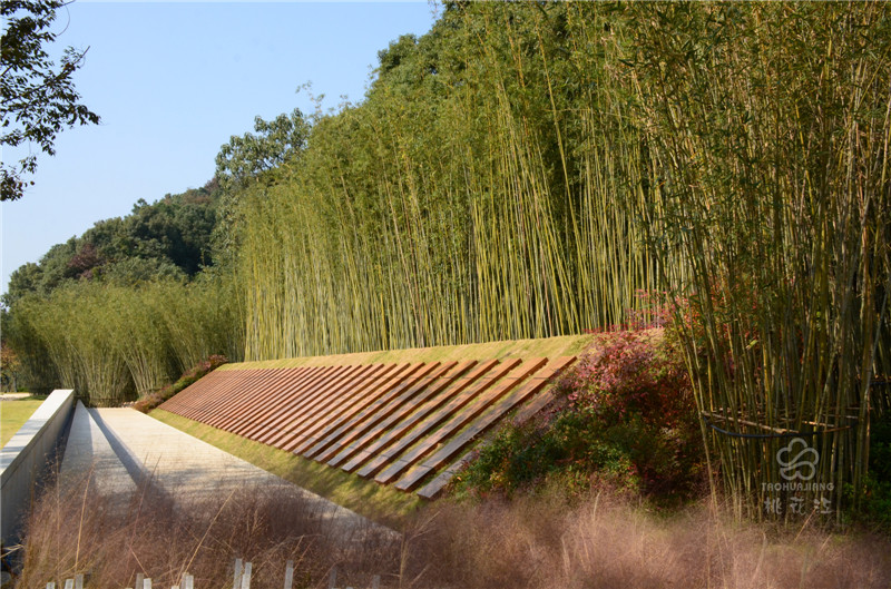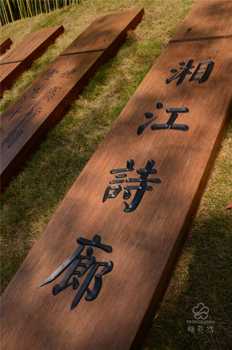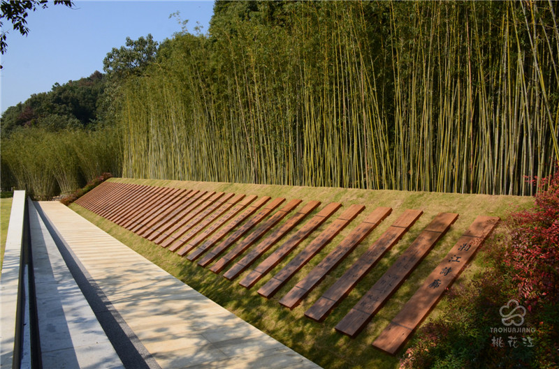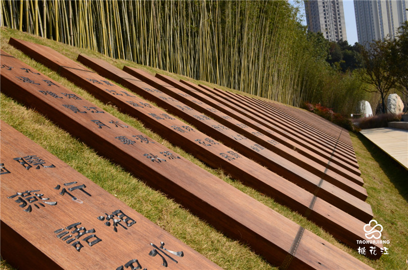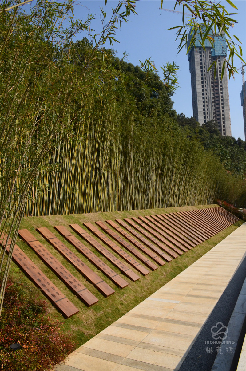 湘江詩廊位于長沙開福區(qū)金霞組團鵝羊山公園,臨湘江北路段,總面積約6000平方米。湘江詩廊種植了大面積的景觀竹,清新自然又別具一格,雕刻詩集的板材均來自于湖南桃花江竹材科技股份有限公司生產(chǎn)的高炭防腐戶外竹材。戶外竹材自然環(huán)保,色澤古樸,性能穩(wěn)定,將詩集刻在竹板上,更加彰顯出歷史文化的厚重感和湖湘文化精神面貌。新鮮翠綠的景觀竹和加工后的重組竹板還有精心雕刻的詩集三者渾然一體,體現(xiàn)了自然山水與人文精神的融合。