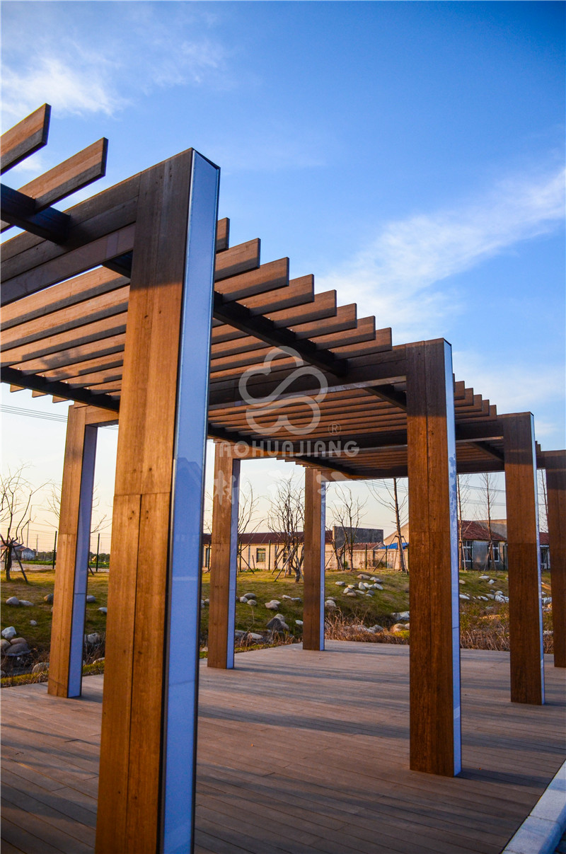 海門農(nóng)副產(chǎn)品會展中心位于江蘇南通海門市開發(fā)區(qū)上海路、黃浦江路交叉口西側(cè),該展銷中心是海門市最大的專業(yè)農(nóng)產(chǎn)品展銷中心。該會展中心的立面裝飾墻板、景觀地板與戶外廊架全部采用湖南桃花江竹材科技生產(chǎn)的高炭防腐戶外竹材。