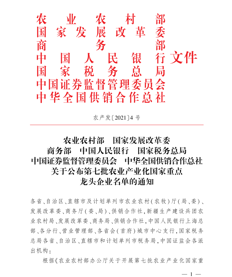 第七批農(nóng)業(yè)產(chǎn)業(yè)化國家重點龍頭企業(yè)認定工作開始于2021年5月,由農(nóng)業(yè)農(nóng)村部會同國家發(fā)展改革委、商務(wù)部、中國人民銀行、國家稅務(wù)總局、中國證券監(jiān)督管理委員會、中華全國供銷合作總社組織開展。經(jīng)各?。▍^(qū)、市)遴選推薦、農(nóng)業(yè)農(nóng)村部組織專家評審、全國農(nóng)業(yè)產(chǎn)業(yè)化聯(lián)席會議審議、公示,決定,全國412家企業(yè)被認定為農(nóng)業(yè)產(chǎn)業(yè)化國家重點龍頭企業(yè)。湖南桃花江竹材的正式獲批實現(xiàn)了桃江縣“零”國家級龍頭企業(yè)的突破。