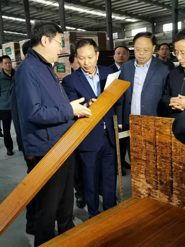 2019年10月15日,湖南省省委書記、省人大常委會(huì)主任杜家毫一行蒞臨我司考察調(diào)研,這也是他任職湖南省后第二次造訪桃花江竹材。湖南省委常委、湖南省委秘書長(zhǎng)張劍飛,益陽(yáng)市市委書記瞿海、益陽(yáng)市市長(zhǎng)張值恒等相關(guān)部門領(lǐng)導(dǎo)陪同調(diào)研。在公司董事長(zhǎng)薛志成的陪同下,杜書記一行深入我司戶外竹材生產(chǎn)車間一線調(diào)研,對(duì)我司生產(chǎn)經(jīng)營(yíng)、人才培養(yǎng)、科技創(chuàng)新和新產(chǎn)品開發(fā)等方面進(jìn)行了調(diào)研。杜書記仔細(xì)端詳公司產(chǎn)品,詳細(xì)詢問(wèn)產(chǎn)品的生產(chǎn)流程,應(yīng)用領(lǐng)域和銷售情況,他對(duì)公司擁有戶外防腐竹材、竹地板、竹墻板等10余項(xiàng)國(guó)家授權(quán)發(fā)明專利的研發(fā)能力表示贊賞,他說(shuō) :"我們需要的就是像桃花江竹材這樣的企業(yè) ,有較強(qiáng)的自主研發(fā)能力,生產(chǎn)的戶外竹材產(chǎn)品,環(huán)保又可持續(xù)發(fā)展,市場(chǎng)前景巨大,發(fā)展竹產(chǎn)業(yè)又能帶動(dòng)周邊竹農(nóng)致富,政府表示大力支持,前不久出臺(tái)的那個(gè)湖南農(nóng)業(yè)優(yōu)勢(shì)特色千億產(chǎn)業(yè)行動(dòng)方案就部署了對(duì)楠竹產(chǎn)業(yè)的發(fā)展規(guī)劃,希望桃花江竹材作為竹產(chǎn)業(yè)的龍頭企業(yè),能充分發(fā)揮引領(lǐng)帶頭作用,提升竹產(chǎn)業(yè)的科技創(chuàng)新能力,為把竹產(chǎn)業(yè)做大做強(qiáng)貢獻(xiàn)更大的力量。"